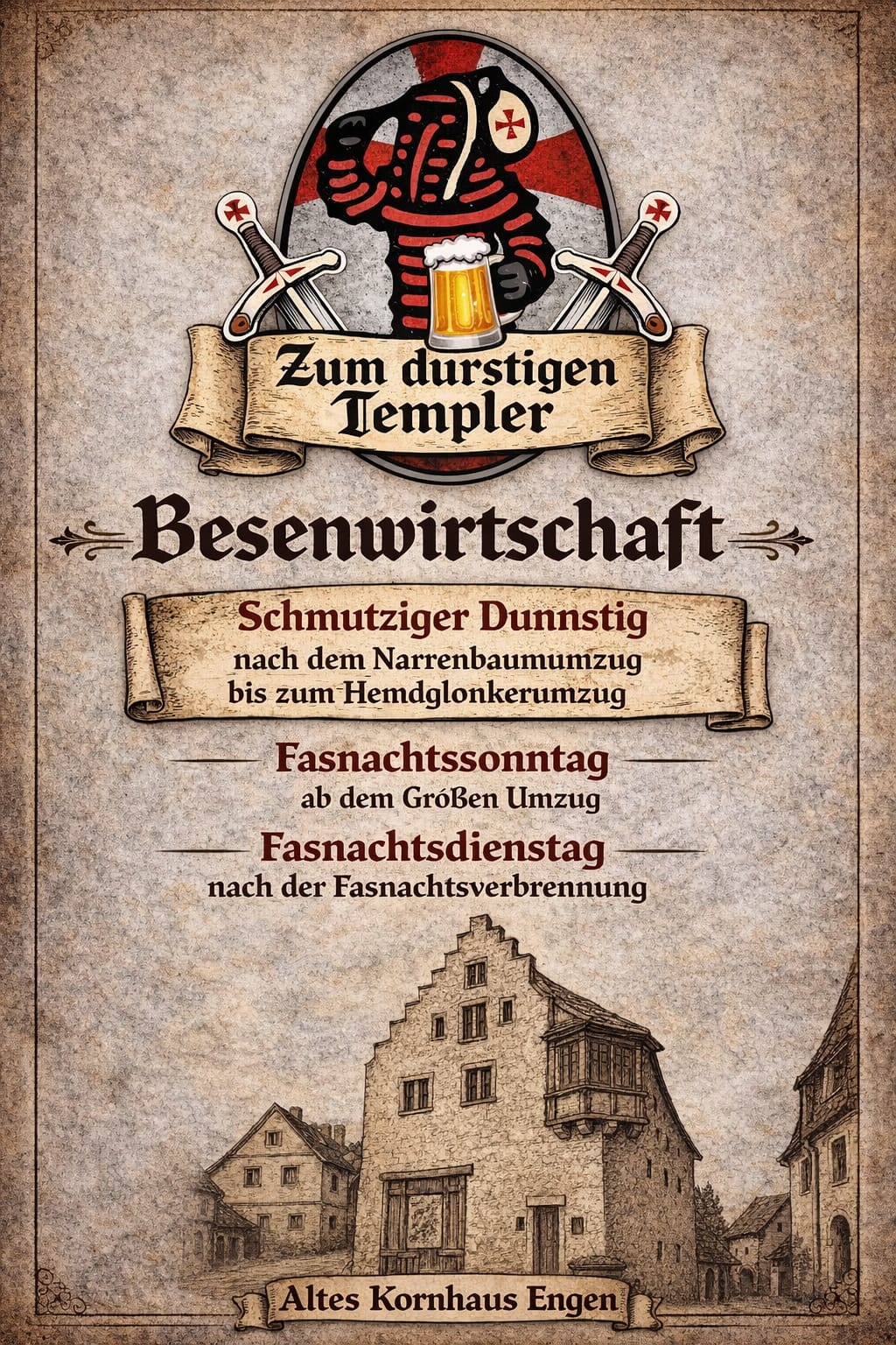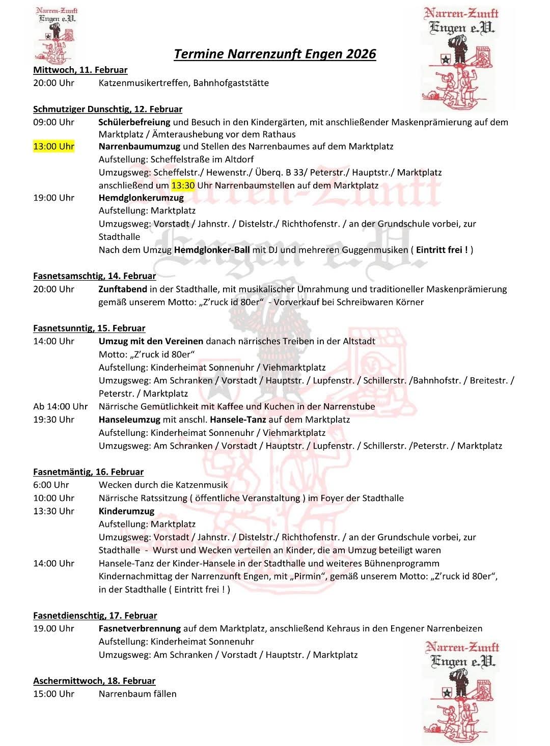 Der Fahrplan für die bevorstehende Fasnet der Narrenzunft Engen e. V. steht. Neu in 2026 ist der Beginnbereits um 13:00 Uhr des Narrenbaum Umzuges und die neue Besenwirtschaft "Zum durstigen Templer" im Kornhaus.