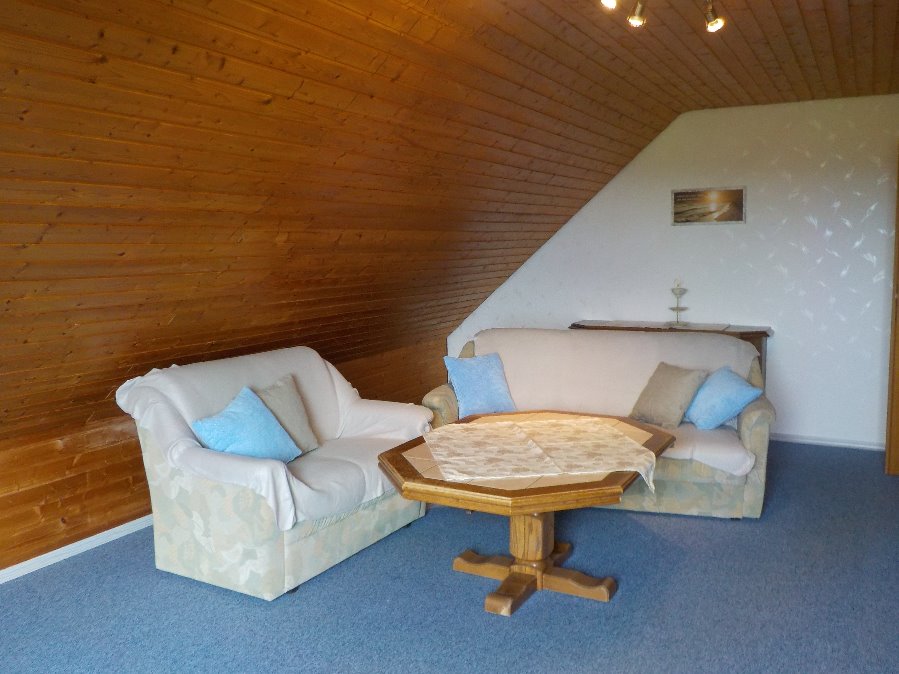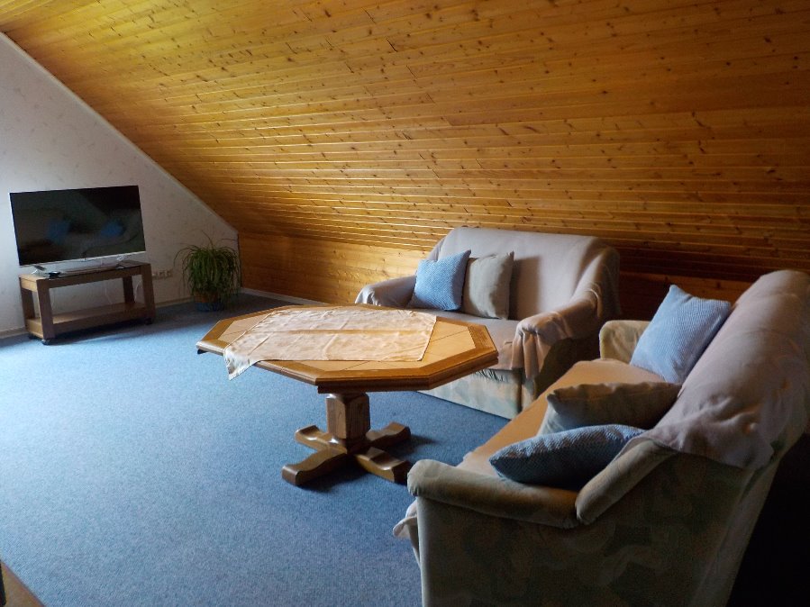 Das große Wohnzimmer mit gemütlichem Sofa lädt nach einem anstrengenden Ausflugstag zum Entspannen ein. Ein TV mit allen gängigen Kanälen ist vor Ort.