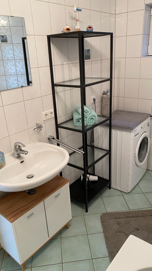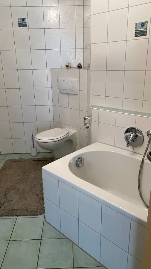 Badezimmer beinhaltet Badewanne, Toilette, Waschmaschine sowie Handtücher und Fön