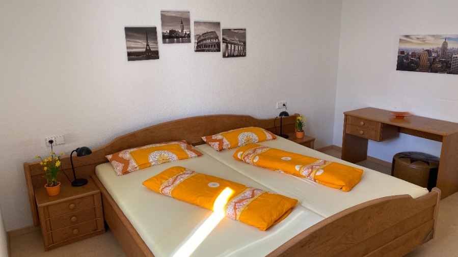 Schlafzimmer hat ein großes Doppelbett, Bettwäsche ist vorhanden.