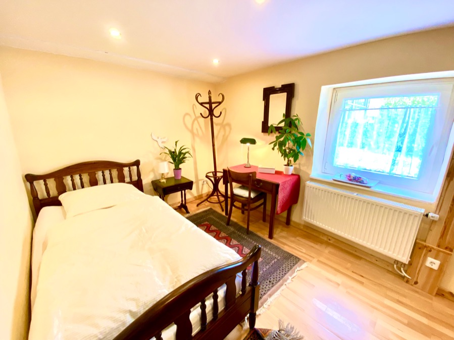 1 helles, kleines, gemütliches Einzelzimmer (Nichtraucher) mit Schrank + Schreibtisch.