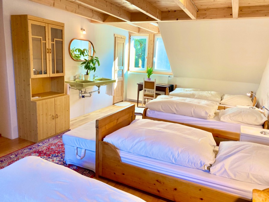 1 sehr helles und ruhiges Fünf-Bett Zimmer (Nichtraucher) mit Doppel-Waschbecken, Schreibtisch und moderner Dusche (Fön vorhanden). Auch als Einzelzimmer oder Doppelzimmer nutzbar. Mit tollem Blick ins Grüne (Garten, Hohenhewen).